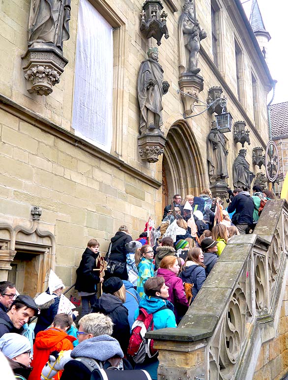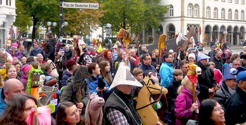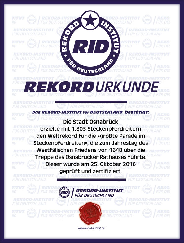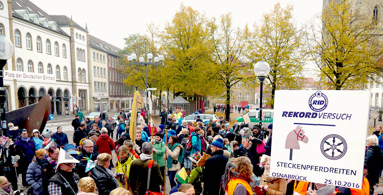 Seit 1948 gibt es die Tradition des Steckenpferdreitens in Osnabrück, der Stadt des Westfälischen Friedens. Erst im letzten Jahr wurde das dortige Rathaus mit dem Europäischen Kulturerbesiegel ausgezeichnet. Und in diesem Jahr hat das Stadtmarketing am 25. Oktober 2016 zum Weltrekordversuch für die nach Teilnehmern weltweit »größte Parade im Streckenpferdreiten« aufgerufen.