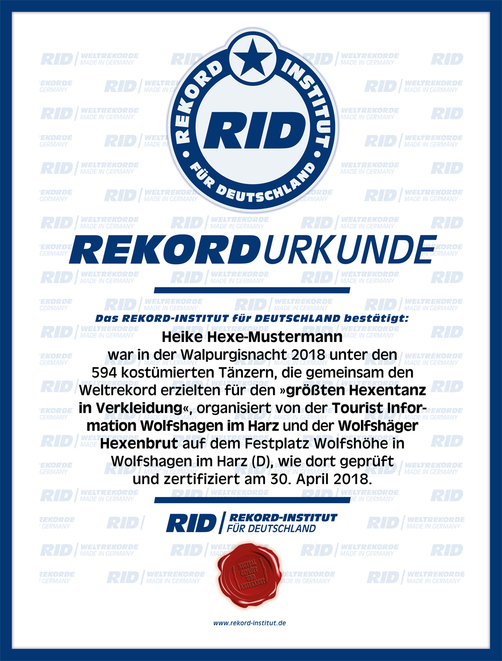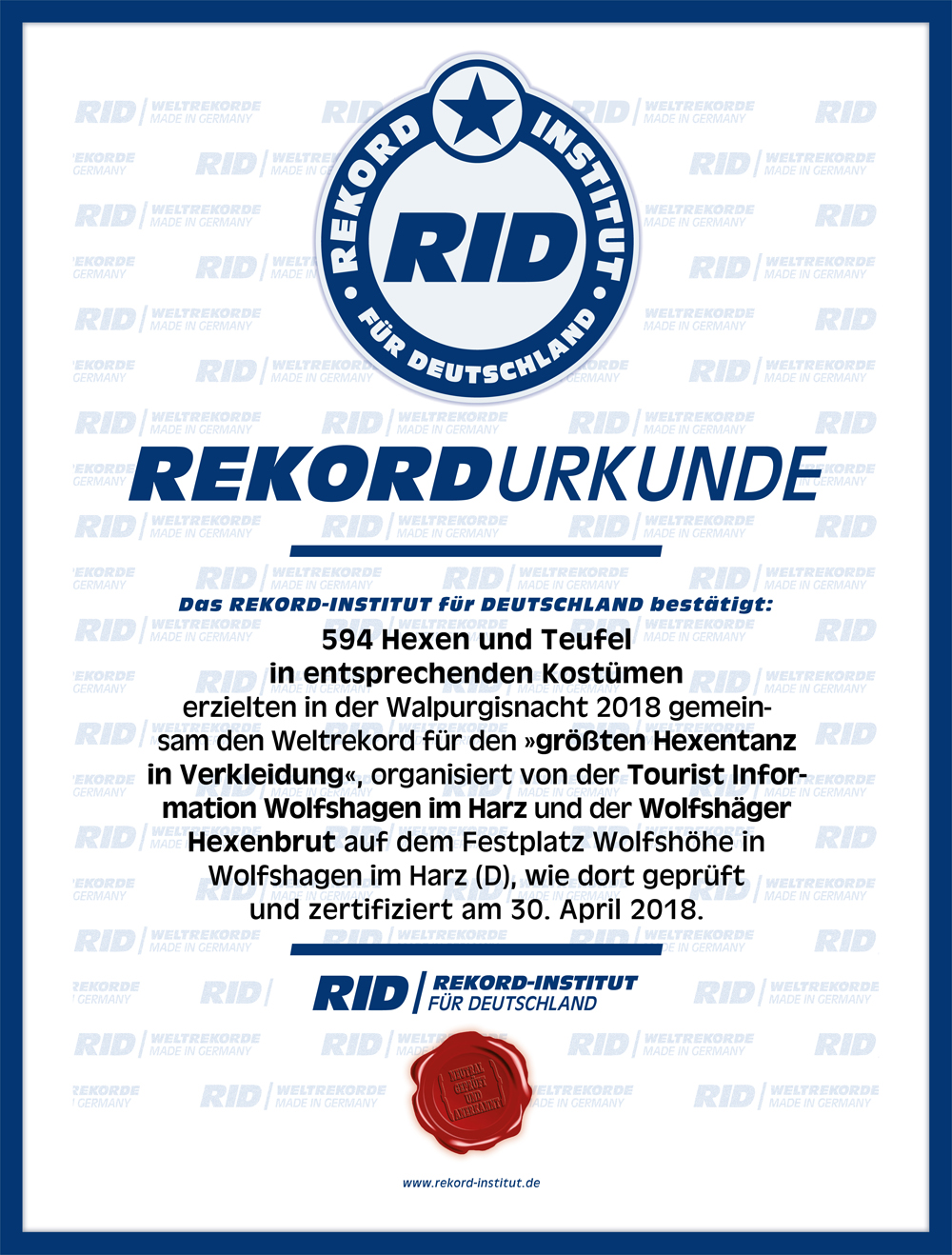 Für den Erstrekord dieser neuen Rekordkategorie »größter Hexentanz in Verkleidung« waren mindestens 222 kostümierte Teilnehmer vorausgesetzt, die 5 Minuten lang tanzen. Das dazu gespielte Lied ist bewusst nicht festgelegt, sondern obliegt den persönlichen und tänzerischen Vorlieben der tanzenden Hexen, die eine einfache Choreografie vorführen müssen.