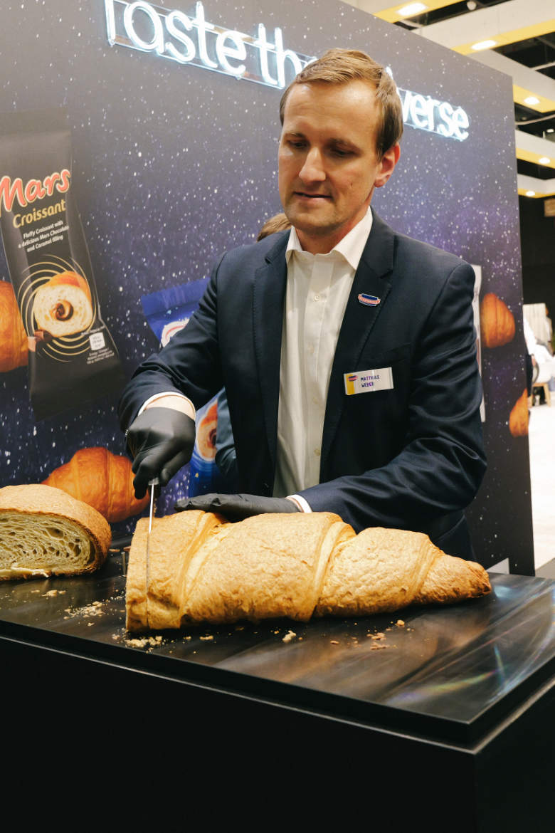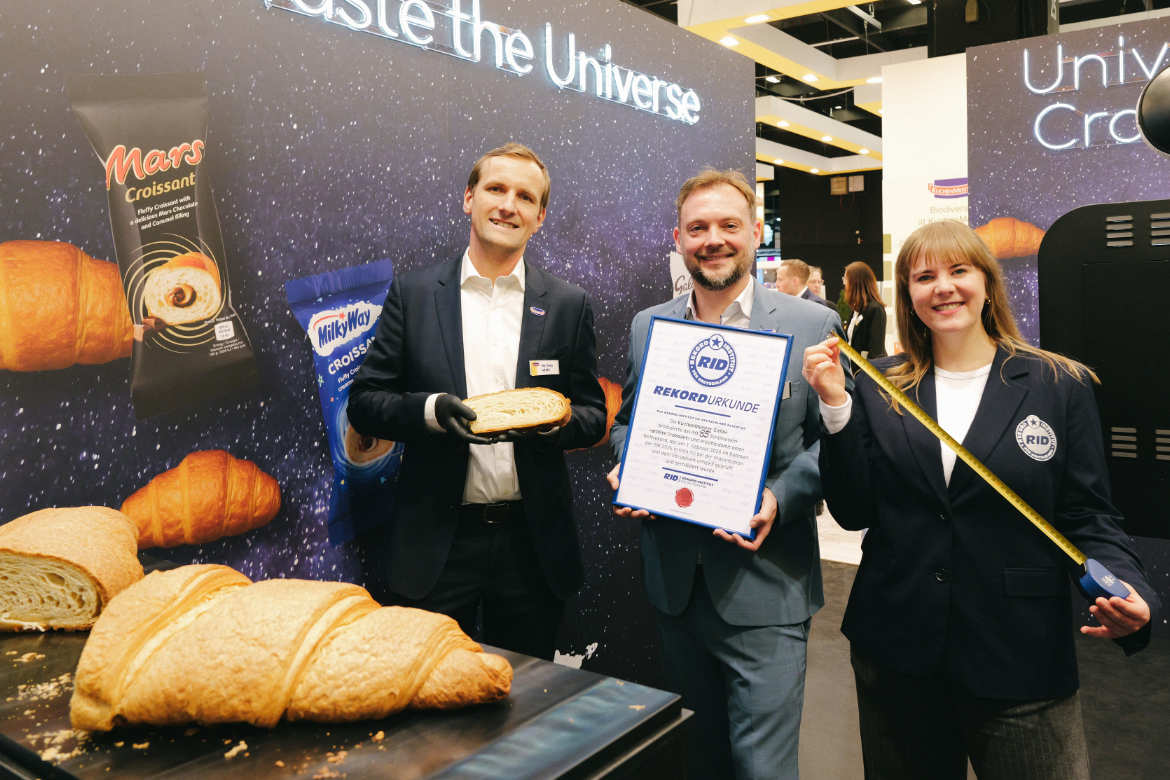 Die Backzeit musste bei deutlich reduzierter Temperatur wesentlich verlängert werden, um eine optimale Backfarbe sowie die perfekte Blätterung zu garantieren. Insgesamt hatte das KuchenMeister-Team etwa 20 Backversuche bis zum perfekten Croissant benötigt.Am 1. Februar 2026 in Köln wurde das finale Weltrekordobjekt präsentiert und vermessen. Dazu war RID-Rekordrichterin Laura Koblischek auf die Messe ISM gereist. Feierlich wurde dort das 3,5 Kilogramm schwere Croissant enthüllt und angeschnitten. Bis zu diesem Zeitpunkt wusste niemand, wie das Plundergebäck von innen aussieht und ob es tatsächlich etwas geworden ist. Erleichterung bei allen Beteiligten – die Blätterung sah nicht nur perfekt aus, sondern es schmeckte auch köstlich. Rekordrichterin Koblischek kostete begeistert das erste Stück des XXL-Croissants: »Außen knusprig und innen fluffig. So muss ein Croissant schmecken. Lecker!«