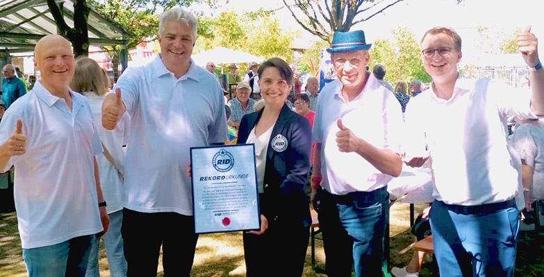 Mit dieser Zahl zertifizierte Eva Ricarda den neuen Weltrekord für die »längste Kaffeetafel« und zeichnete Günter Köck, Maximilian Fuchs und Ralf Müller vom Kur- und Gewerbeverein sowie Bürgermeister Tobias Kurz mit einer RID-Rekordurkunde aus.Fotos: Thermenwelt Füssing (3); Rekord-Institut für Deutschland (3)