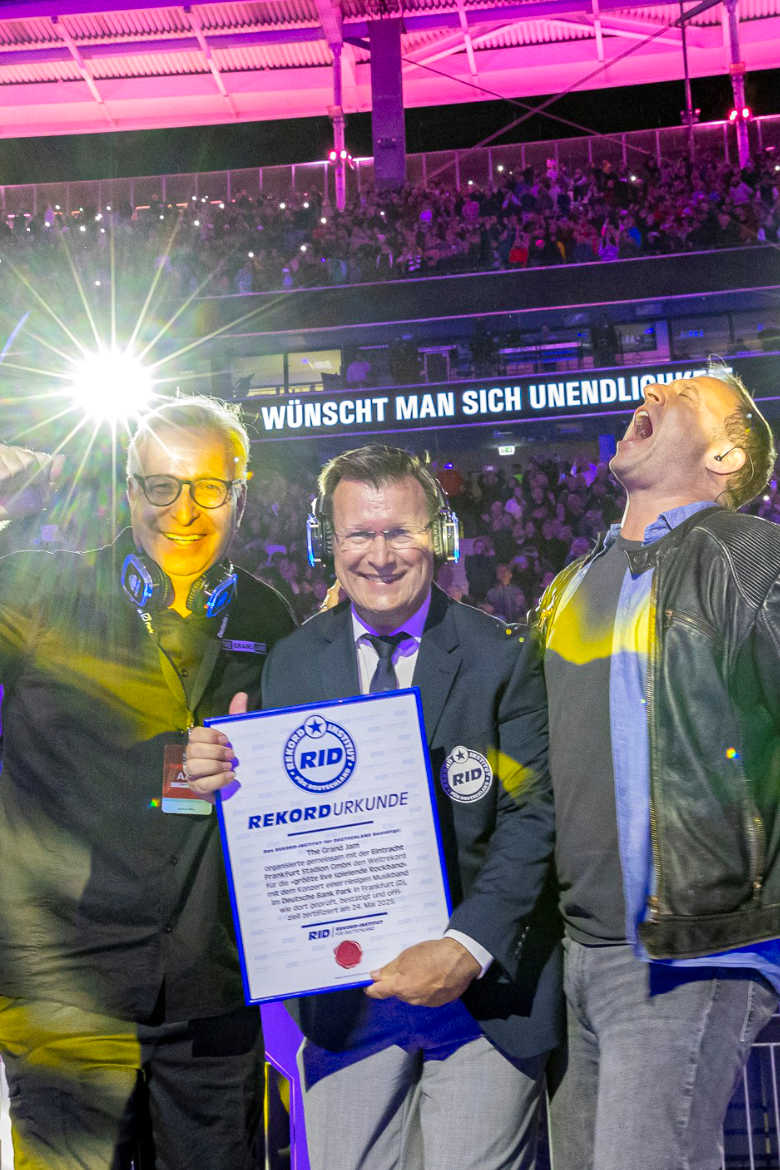 Dann wurde es ernst: Nach den letzten Proben füllte sich der Deutsche Bank Park Frankfurt mit dem erwartungsvollen Publikum. Auch ins Stadion gekommen war RID-Rekordrichter Olaf Kuchenbecker, der privat selbst Bass in einer Rockband spielt. Er beobachtete den Einzug der übergroßen Rockband und zählte die Teilnehmenden. Neben 600 Sängerinnen und Sängern bildeten über 150 Schlagzeuge, rund 200 Gitarren, 80 Bassisten sowie zahlreiche Keyboards, Trompeten, Posaunen, Saxophone, Violinen, Bratschen und Celli das riesige Ensemble.Alle Instrumentengruppen gemeinsam performten für das fast 20.000 Personen starke Publikum eine bunte Mischung von Songs aus der ersten Konzertphase im Waldstadion bis zur jüngsten Vergangenheit. Als großen Höhepunkt des Abends zertifizierte Rekordrichter Kuchenbecker kurz vor Konzertende den neuen Weltrekord. Exakt 1.231 Bandmitglieder hatten das rund eineinhalb Stunden dauernde Konzert gespielt und waren damit nun ganz offiziell die »größte live spielende Rockband«. Stellvertretend für alle Musizierenden zeichnete Kuchenbecker Stadionchef und Organisator Patrik Meyer mit der RID-Rekordurkunde aus.